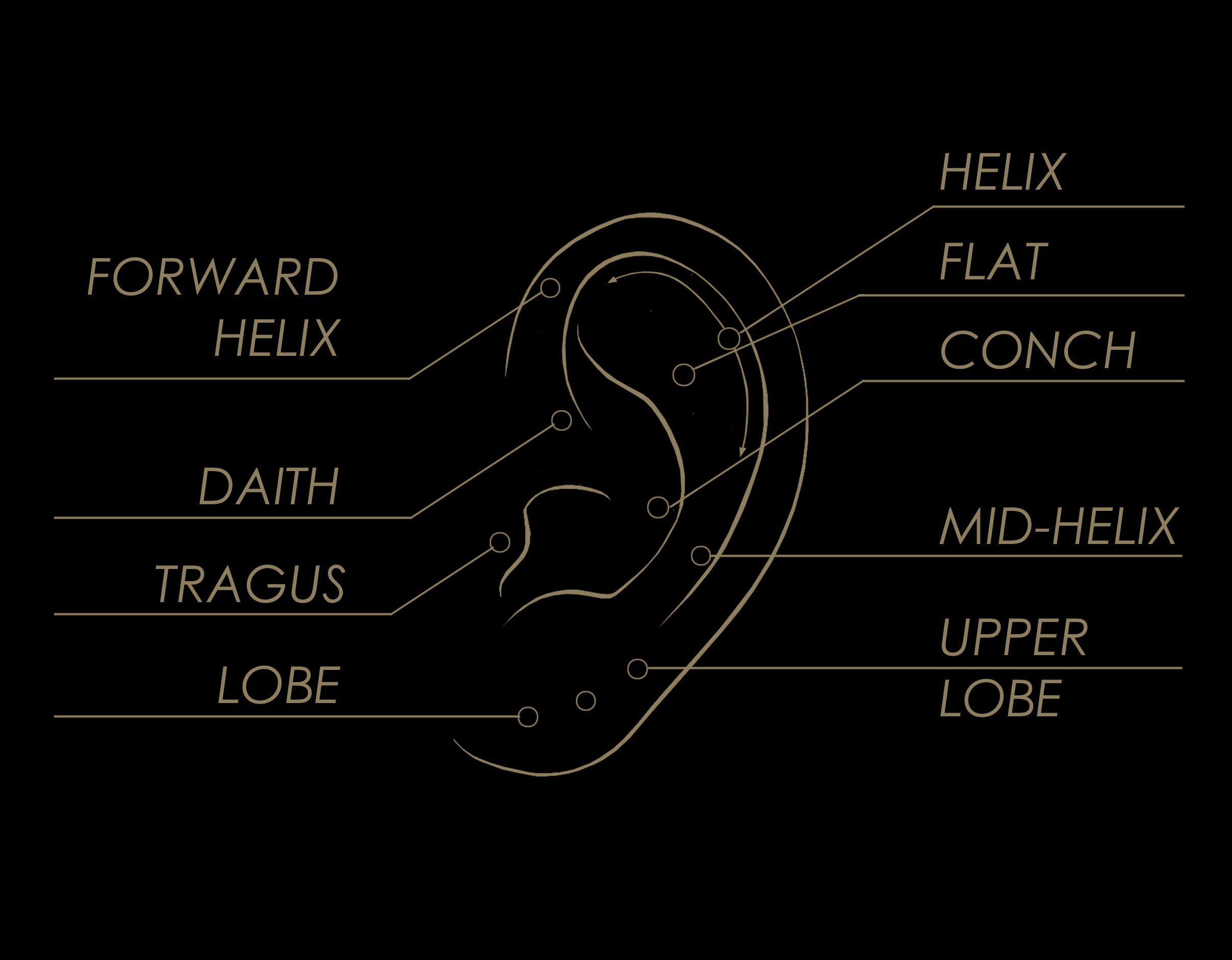 Posizionato appena sopra il lobo e appena prima della cartilagine dell’orecchio, tempi di guarigione 6-8 settimane in media;